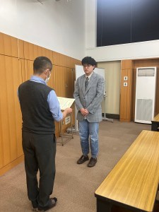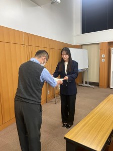 学科主任から4年生最優秀賞の賞状をうけとる来栖さん