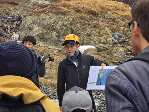 2025年12月13日(火)に長崎県五島市奈留町(奈留島)にて本学科の金丸 龍夫准教授が講演・現地案内しました。本講演・現地案内は五島市ジオパーク推進協議会が企画したものです。講演では、日本列島の成り立ちから五島列島の位置づけ(意義)に触れ、五島列島の成り立ちを参加者の方に分かりやすく説明しました。現地観察では、奈留町北部のノコビ浦にて実際の露頭を前にしながら、その岩石の種類や成因について解説しました。